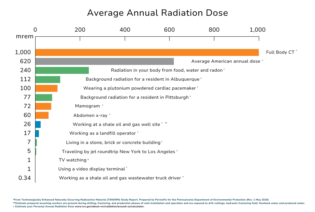 When considering radiation doses from oil and gas operations, we can use the Technologically Enhanced Naturally Occurring Radioactive Materials (TENORM) Study by the PA Department of Environmental Protection to compare to other real-world doses, assuming workers are present during drilling, fracturing, and production phases of operations and are exposed to drill cuttings, hydraulic fracturing fluid, flowback water, and produced water.