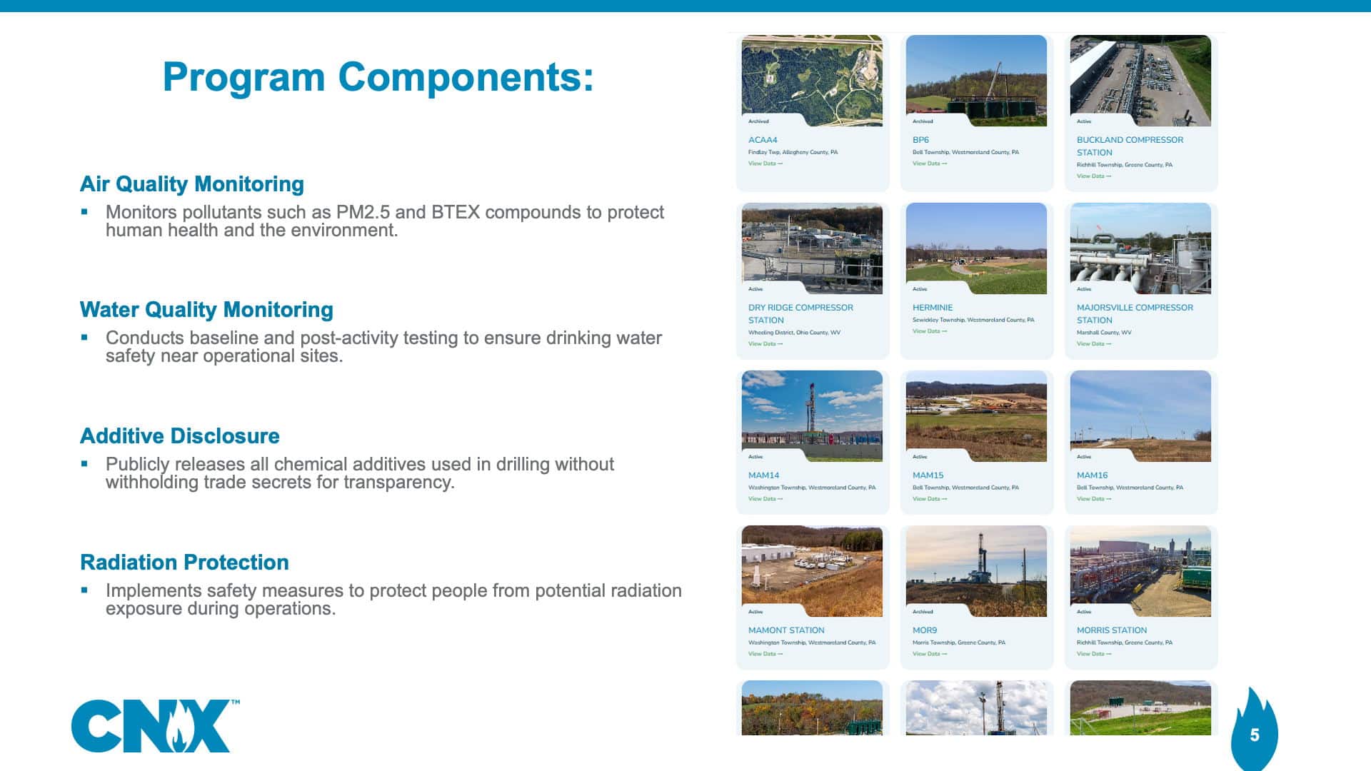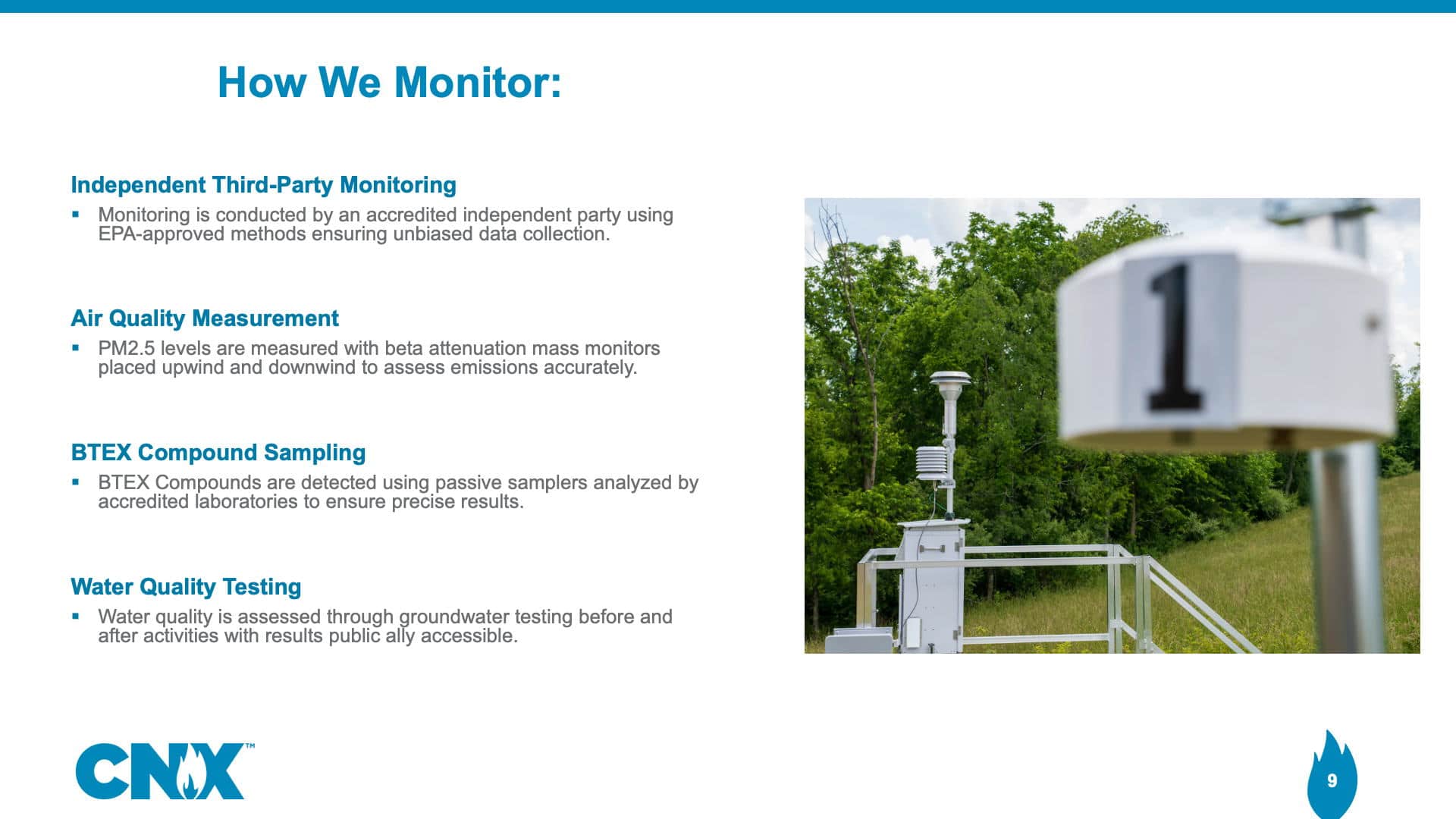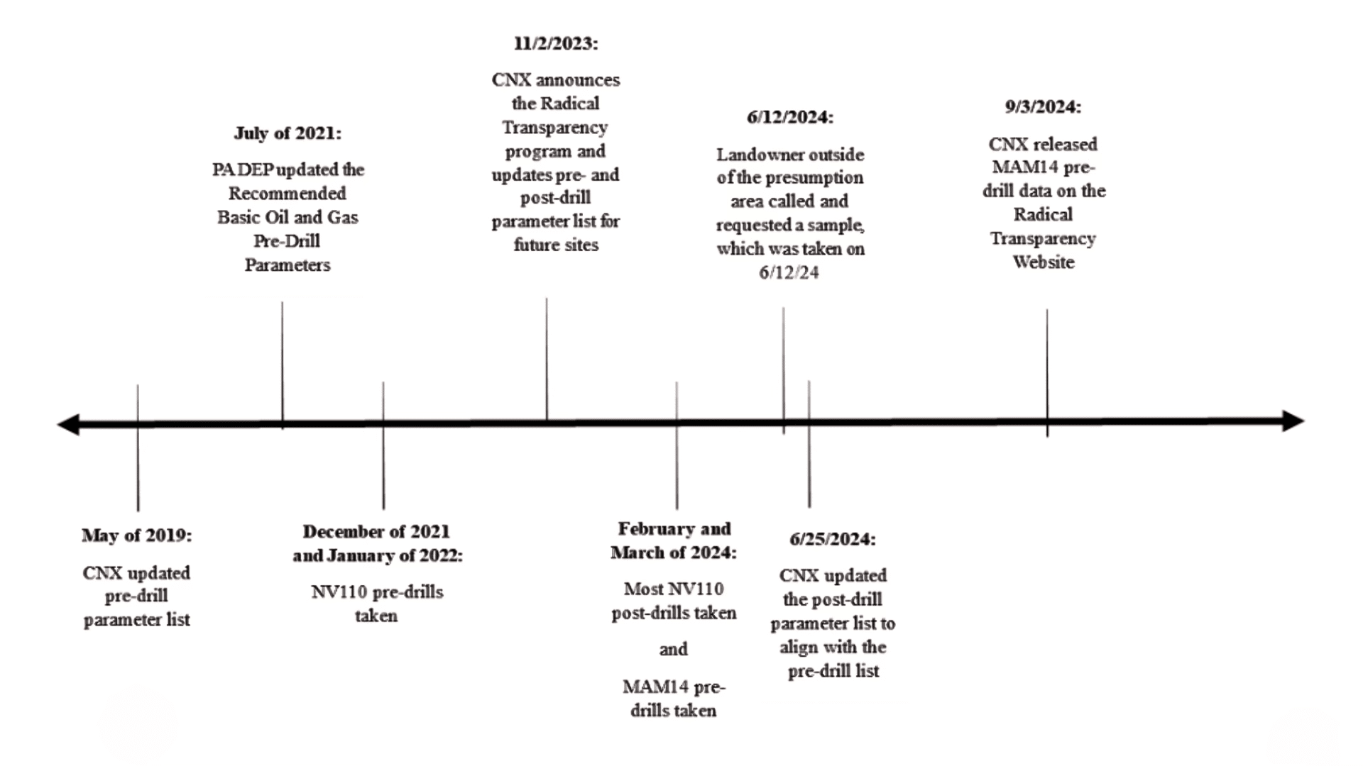 For water quality, CNX has expanded monitoring of private drinking water within 2,500 feet of a well bore by conducting four quarterly samples before and after drilling, exceeding regulatory and industry standards.