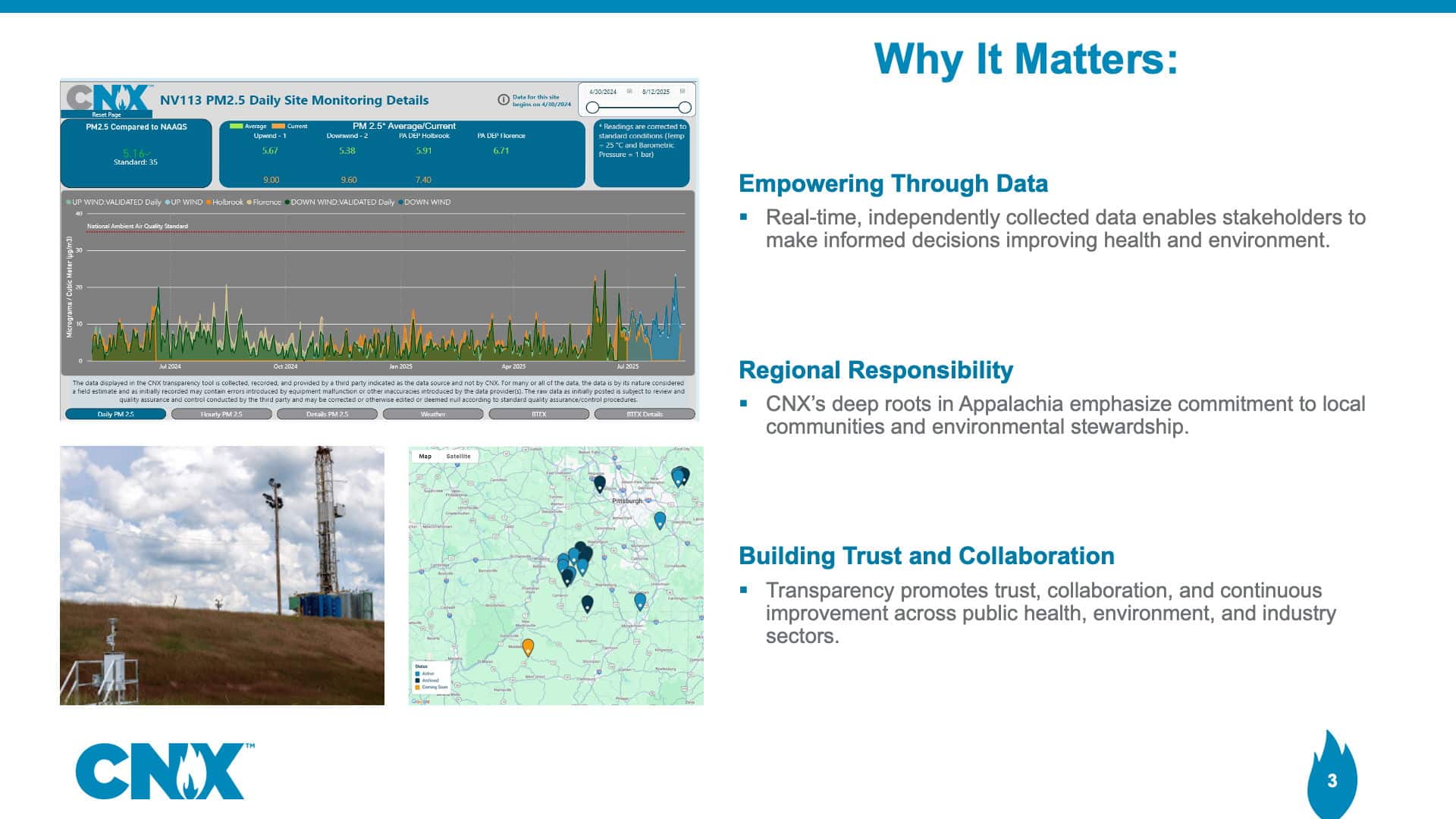 Internally, CNX uses this data to spot trends, refine operations, and reduce emissions. Externally, the Pennsylvania DEP uses Radical Transparency to launch greenfield site monitoring, which will continue through the site’s full development—providing independent validation of the program’s value and reliability. Background air quality monitoring at this location began earlier this year.