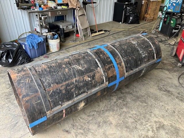 The two main components of the smoker (the main cooking chamber or “barrel” and the smoke chamber or “firebox”) started their lives as scrap pieces from the MAM14 Utica conductor string. The conductor casing is 30″ in diameter and has a wall thickness of 3/8″. At 118 pounds per foot, these two pieces have a combined weight of over 1,400 lbs!