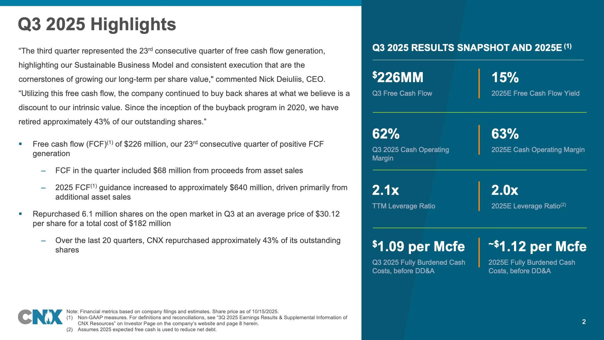 The company demonstrated disciplined capital allocation throughout the quarter, repurchasing 6.1 million shares at an average price of $30.12 per share for a total investment of $182 million. Since the inception of the buyback program in 2020, CNX has retired approximately 43% of its outstanding shares at an average price of $18.86 per share, representing a compound annual growth rate of approximately negative 11%.