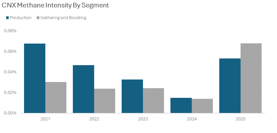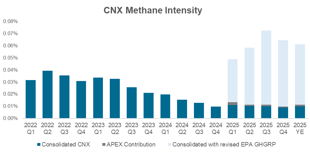 CNX methane intensity increased in 2025 associated with the Revised EPA Greenhouse Gas Reporting Program (GHGRP).