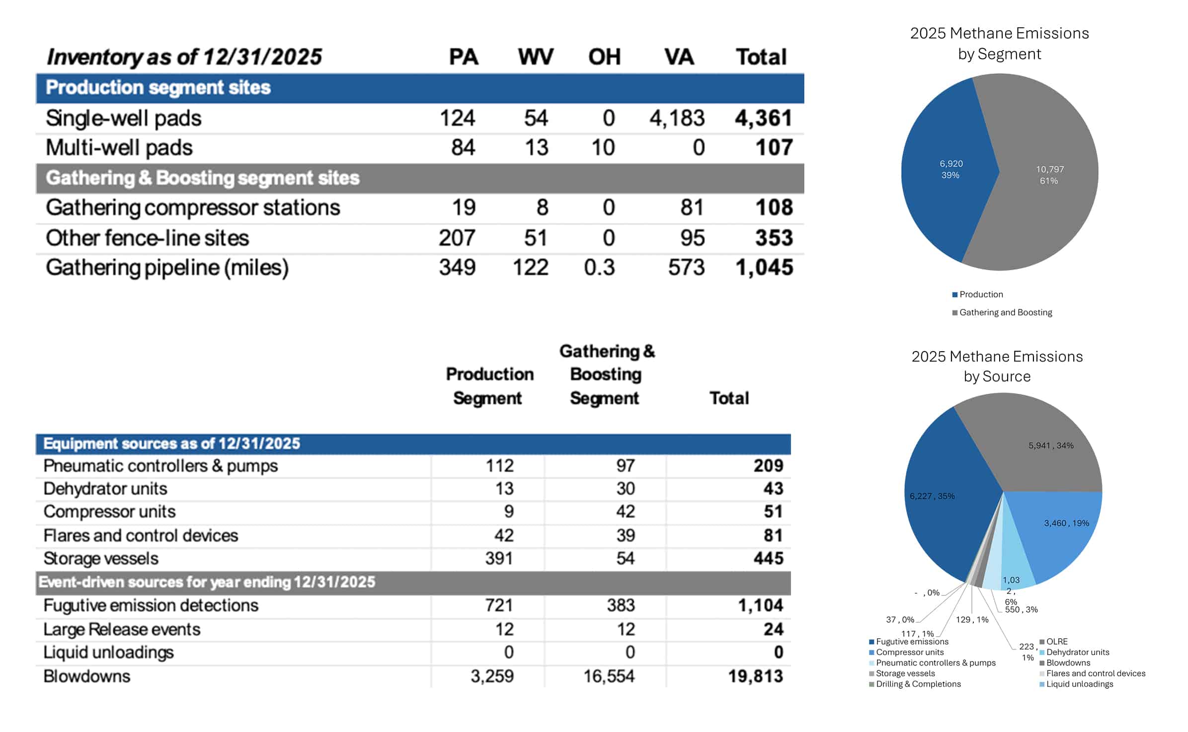 The second table shows the counts of major sources of methane emitting equipment we had in service at the end of 2025 and the number of major event-driven sources of methane emissions we had during the year. Next to the table is a chart that shows the percentage contribution for each of the sources during 2025.